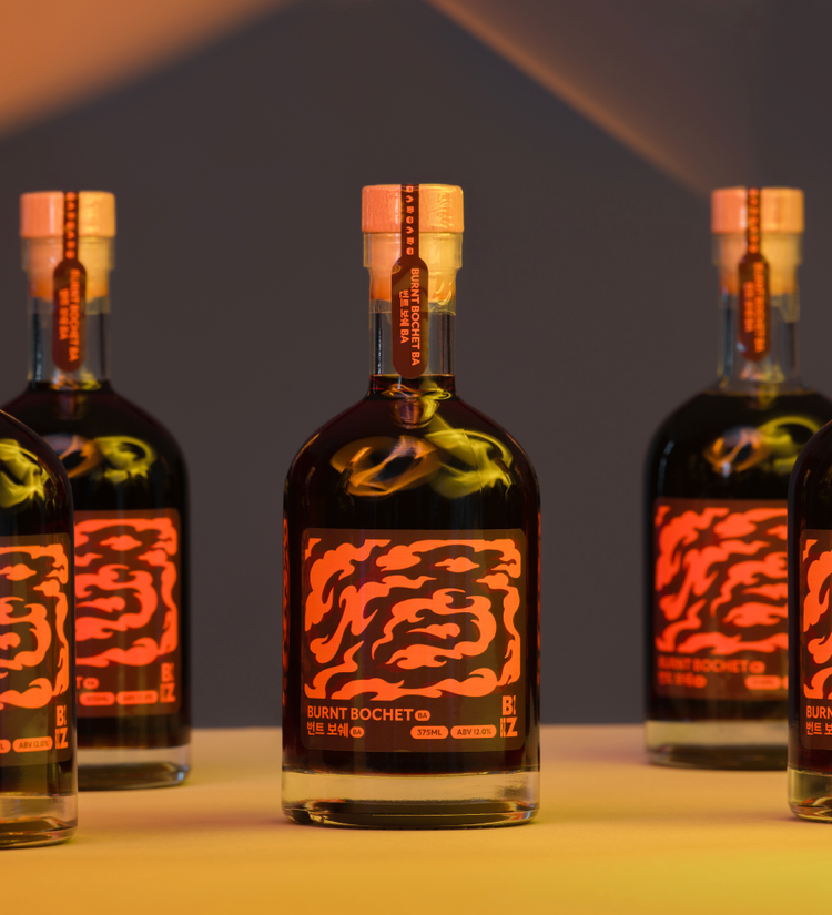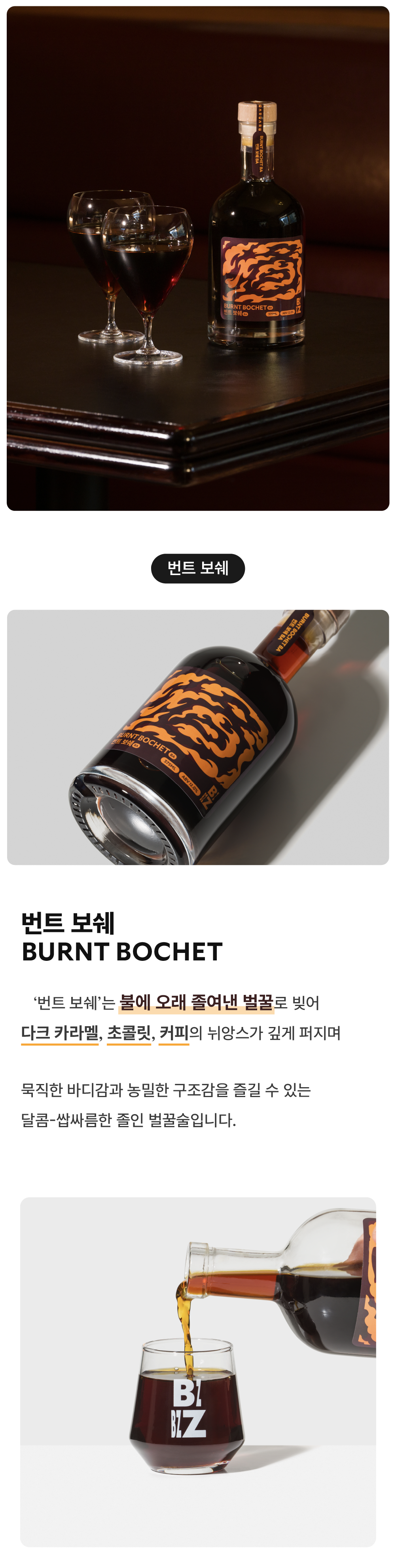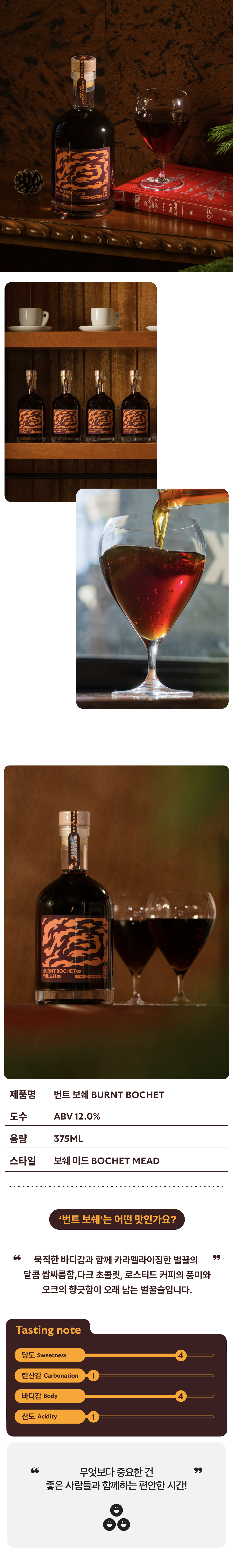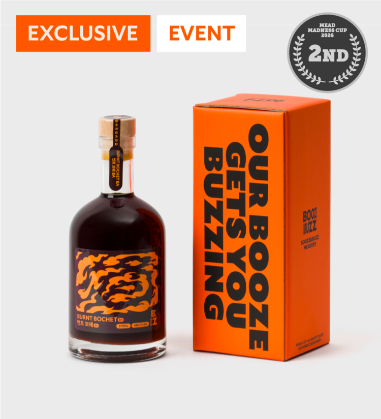 - 12개월 위스키 배럴에 추가 숙성을 거친 카라멜라이징 벌꿀술(Bochet Mead)