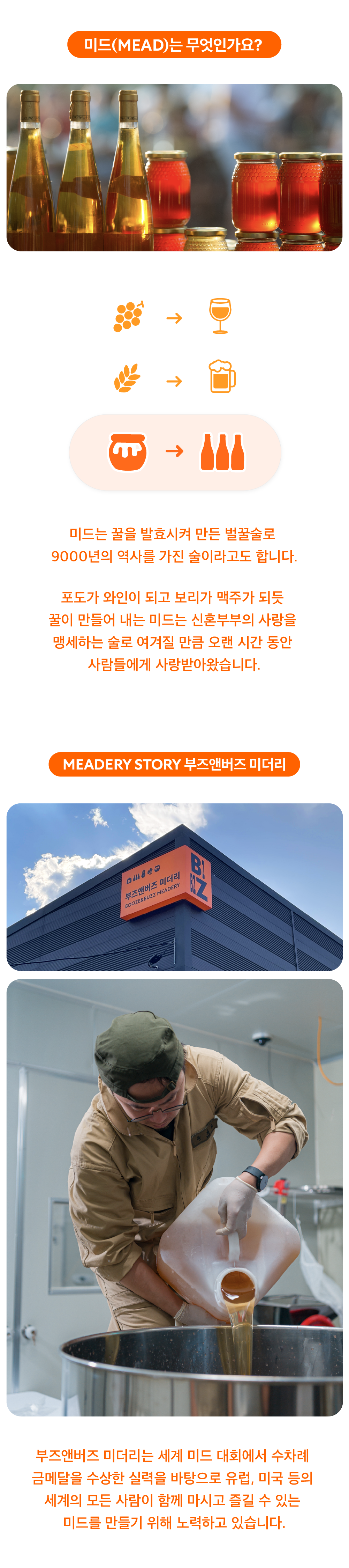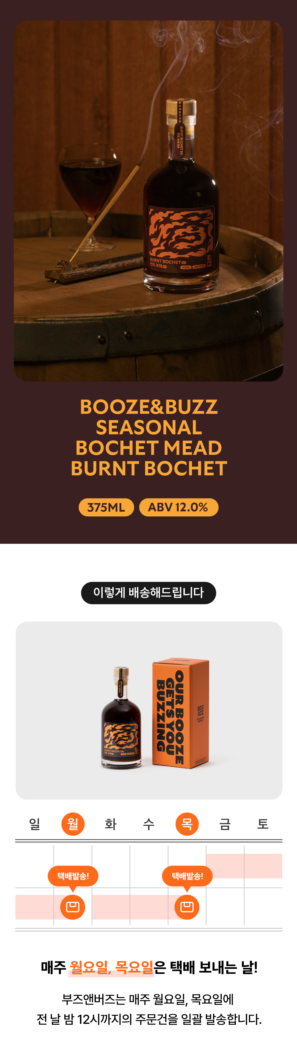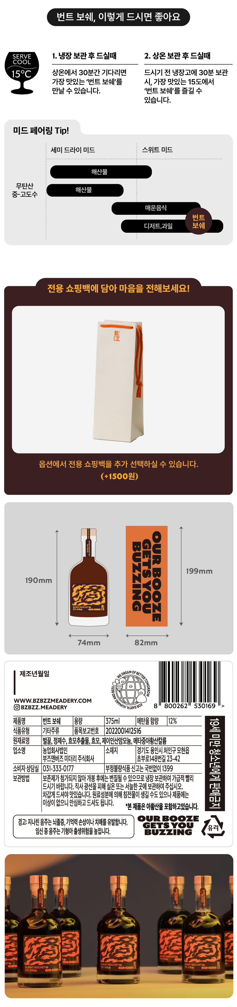 - 12개월 위스키 배럴에 추가 숙성을 거친 카라멜라이징 벌꿀술(Bochet Mead)